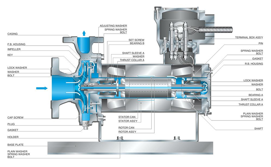 Canned motor pump, also known as packingless pump or hermetically sealed pump, is a type of static seal pump. It adopts an integrated "water pump + motor" structural design, where the pump and the driving motor are connected together and enclosed in a pressure shell filled with the pumped medium. The rotor of the motor and the impeller of the pump are fixed on the same shaft, and a canister is used to separate the rotor and stator of the motor. The rotor operates in the conveyed medium, and its power is transmitted from the stator magnetic field to the rotor.